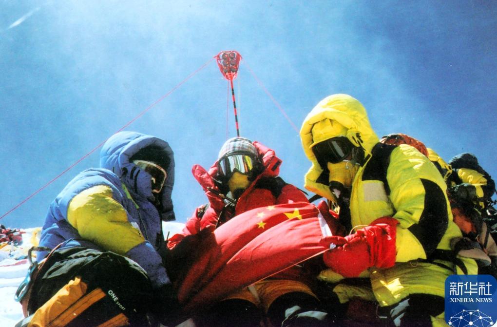 2005年5月22日,中國重測珠峰高度測量登山隊(duì)隊(duì)員在峰頂操作完設(shè)備后合影留念。新華社發(fā)