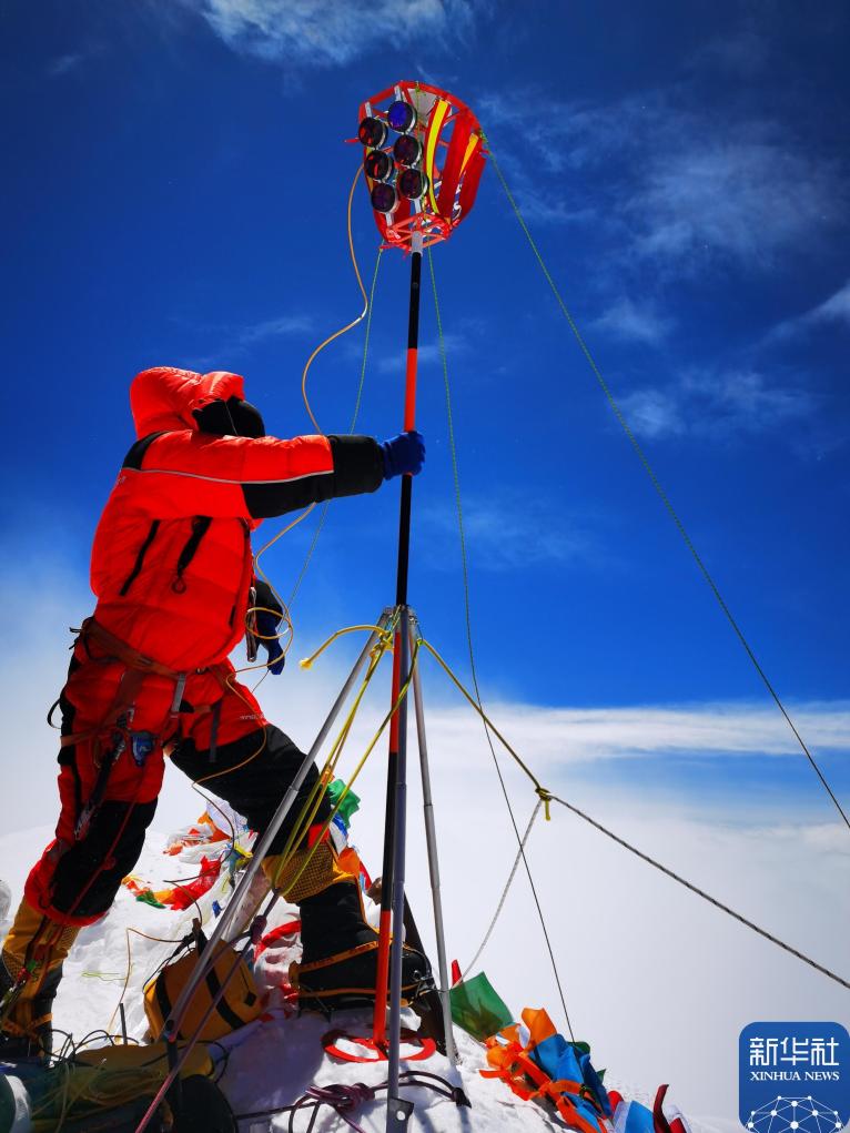 2020年5月27日,2020珠峰高程測量登山隊(duì)隊(duì)員在珠峰峰頂開展測量工作。新華社特約記者 扎西次仁 攝