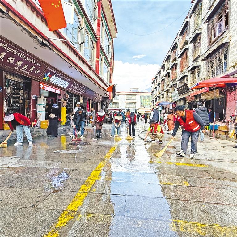 近日,拉薩市城關區(qū)八廓街道沖賽康社區(qū)黨總支開展“黨建引領聚合力,清潔家園促文明”環(huán)境整治活動。30余名黨員志愿者、駐社區(qū)工作隊員及網(wǎng)格員分工協(xié)作,手持清潔工具深入大街小巷,清理衛(wèi)生死角、鏟除墻面小廣告,并對廣場地面進行高壓沖洗?;顒右浴包h建紅”引領“生態(tài)綠”,推動基層治理與文明城市創(chuàng)建深度融合,為社區(qū)居民營造整潔宜居的生活環(huán)境。記者 央金 攝