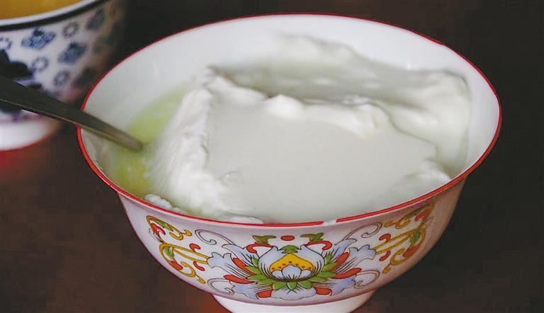 除了常規(guī)的高蛋白大餐,西藏還有許多特色美食,酸奶拌飯便是夏日爽口美食之一。酸奶帶著牦牛奶獨(dú)特的鮮味,提煉后形如“豆腐腦”,白嫩滑溜,口感微酸與微甜交織,令人身心愉悅。在藏族世代延續(xù)的飲食文化中,酸奶拌飯因其豐富的營養(yǎng)價值,深受人們喜愛。