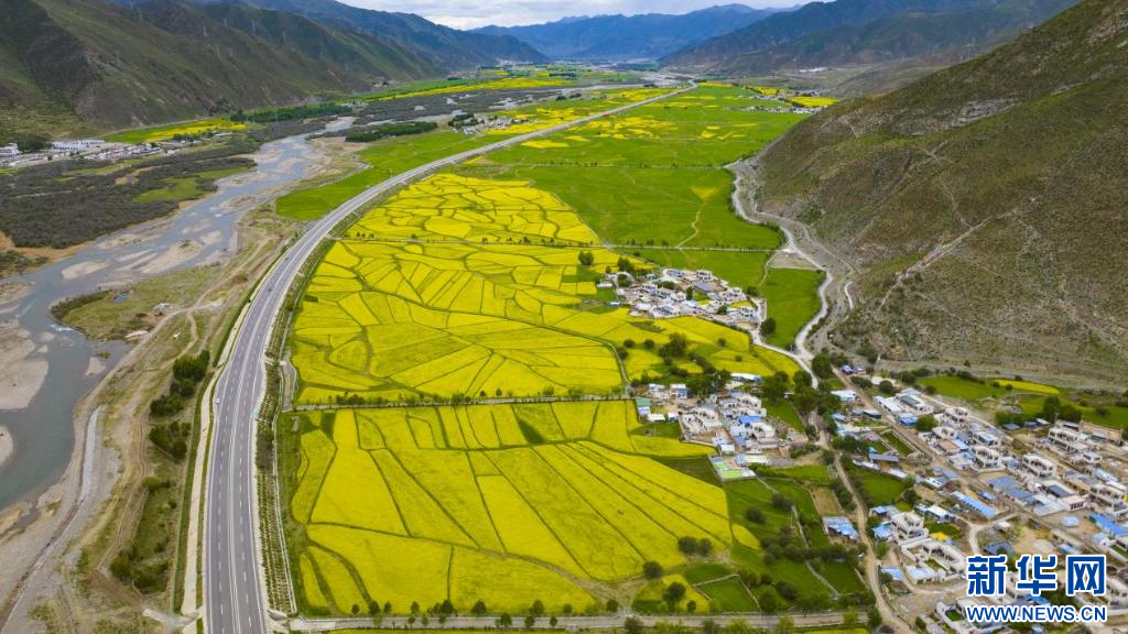 圖為7月2日拍攝的俯瞰墨竹工卡縣扎西崗鄉(xiāng)加爾多村油菜花田(無人機(jī)照片)。新華網(wǎng)發(fā) 洛克 攝
