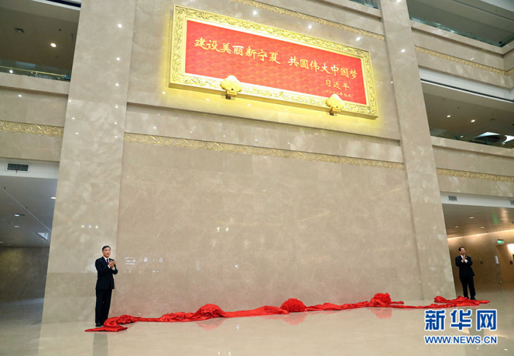 2018年9月19日,中共中央政治局常委、全國(guó)政協(xié)主席、中央代表團(tuán)團(tuán)長(zhǎng)汪洋率中央代表團(tuán)出席向?qū)幭幕刈遄灾螀^(qū)贈(zèng)送紀(jì)念品儀式。這是汪洋和時(shí)任寧夏回族自治區(qū)黨委書(shū)記、人大常委會(huì)主任石泰峰一同為習(xí)近平總書(shū)記題詞賀匾揭幕。攝影:新華社記者 劉衛(wèi)兵