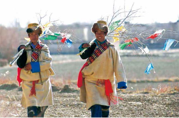 新年慶典活動(dòng),在正月初一天亮之前就開始了。早晨?jī)扇c(diǎn)鐘,女主人要到附近的神泉和圣河里去背頭輪水。傳說(shuō)大地之王辛赤曲杰除夕之夜要把雪山獅的奶灑在江河的源頭,誰(shuí)最勤快,誰(shuí)起得最早,誰(shuí)能背到頭輪水,誰(shuí)就有福氣、有財(cái)運(yùn)。
