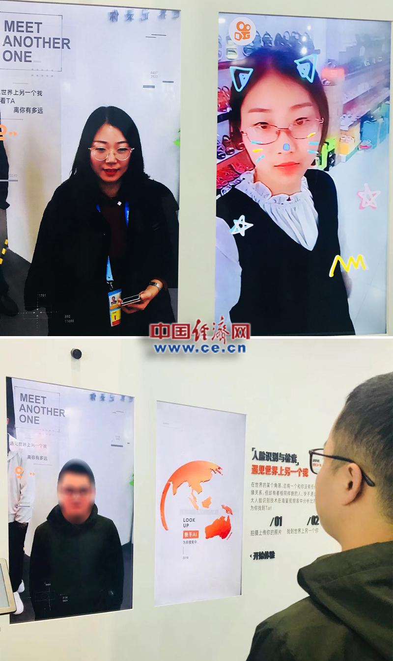 在茫茫人海之中找到與自己長(zhǎng)相相似的人,就如大海撈針一般。在快手展臺(tái)上,記者體驗(yàn)了一回找到另一個(gè)自己的感覺(jué),站在攝像頭前,倒計(jì)時(shí)3s后,左右兩塊屏幕上就分別出現(xiàn)了自己剛剛拍攝的照片和一個(gè)與自己長(zhǎng)相非常相似的人。王婉瑩/攝