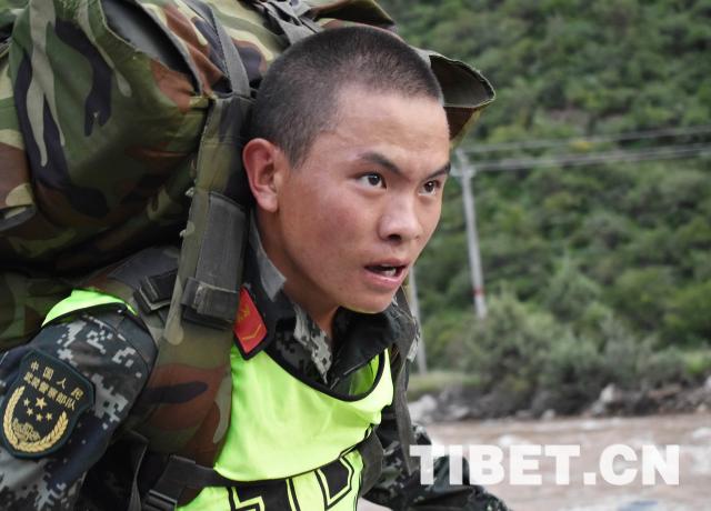 圖為藏族班長覺次仁,一人肩扛兩個背囊,“飛奔”在五公里武裝越野比武考核的路上。