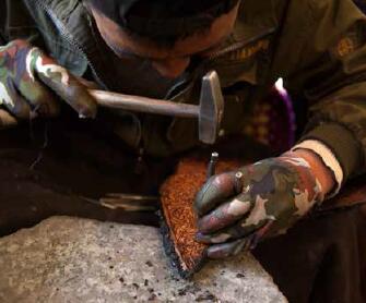 作為銅雕鎦金雪堆白手藝傳承人之一的米瑪已經(jīng)跟隨師傅多年。他告訴記者,無論是建造寺廟的金頂還是浮雕,都需要大量的銅皮。這些銅皮主要用的是黃銅、紫銅和紅銅。將材料備好之后,先用墨筆繪畫出物體的輪廓到紙上,再復(fù)制到銅皮上,然后把銅皮放到木砧上反復(fù)敲打,具象的表面輪廓被逐漸敲打而出,而后再進(jìn)行雕刻。