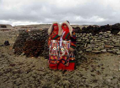 瑪旁布姆卡是西女國女王居住的城堡,普蘭縣文化局局長加措根據(jù)藏文大字典和《阿里史地探秘》的“瑪旁布莫卡”,解釋出“布”的漢文詞義,就是女人、女性、女子或者女王?!澳本褪窍悴莼蛘呦悴荼椴即松?。據(jù)當?shù)匕傩战榻B,城堡遺址坐落在普蘭神湖瑪旁雍措湖的東部扎藏布溫泉溝南側(cè)的野嶺上,海拔5000米上下。在遺址上部高處還有一個碩大蘑菇形狀的巖石巋然迎風屹立城堡上方,與下方城堡遺址交相輝映。這即是“出俞石、朱砂、麝香、牦牛、駿馬、蜀馬,尤多鹽,恒將鹽向天竺興販,其利數(shù)倍”西女王國的王城。在城堡上方更高處的山后,遺留有眾多的洞穴,說明女國的百姓就居住在女王的周圍。此外在山坡的下方扎藏布溝處,當?shù)匕傩辗Q這塊地方為“卡爾青”,意思是大城堡之地。盡管史書上的記載十分有限,瑪旁布姆卡的故事仍然世世代代流傳在當?shù)匕傩盏男闹小;魻柎逡晃荒赀~的老百姓告訴筆者,溫泉溝和曲古寺廟附近就有許許多多女王的傳說,聽說女王曾經(jīng)在此沐浴,但不知具體在什么地方。