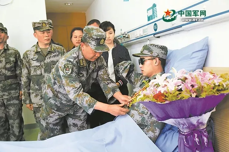 2018年11月24日,掃雷大隊(duì)為躺在病床上的杜富國(guó)頒授一等功獎(jiǎng)?wù)?,他?xí)慣性地舉起右臂,向頒獎(jiǎng)?wù)咧乱詿o手的軍禮。