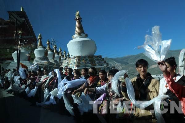 班禪大師到來當(dāng)天,結(jié)古寺大門口煨桑的香煙繚繞,用白石灰畫的迎接道花紋華美,玉樹市的群眾在道路兩旁歡迎班禪大師的車隊。