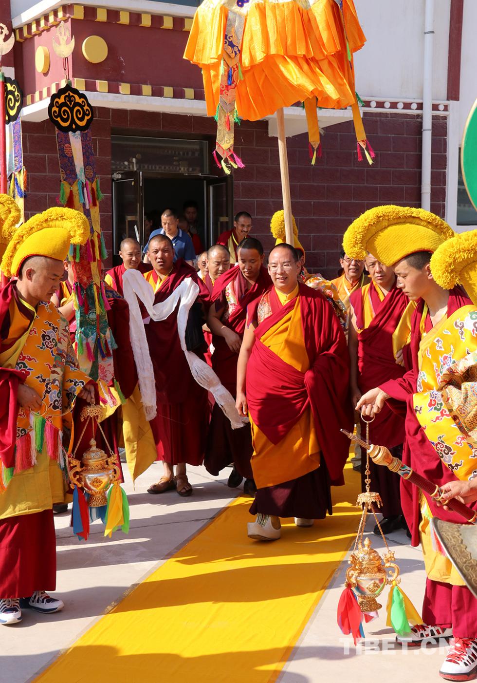 7月21日,清晨5點(diǎn)多,車(chē)隊(duì)來(lái)到位于西寧市湟中縣靜謐的塔爾寺。只見(jiàn)一位僧人穿著絳紅色的僧裝,走下車(chē),這時(shí)早早迎候在塔爾寺門(mén)口的僧人儀仗隊(duì),鼓樂(lè)齊鳴,隆重歡迎這位重要的僧人——班禪額爾德尼o確吉杰布。