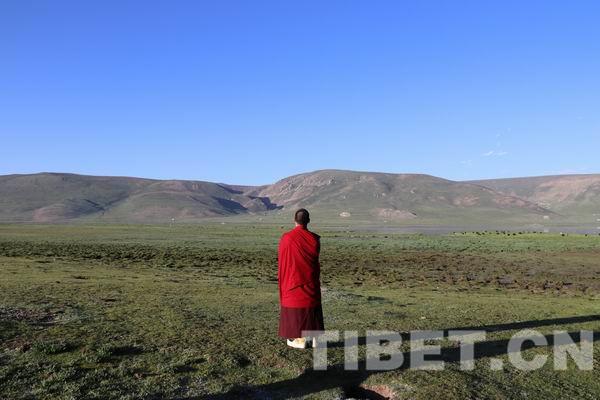 7月19日清晨,從玉樹市往西北約80公里的隆寶灘邊停下一個(gè)車隊(duì),一位身著絳紅色僧服的年輕僧人走下車來,興致勃勃地步向隆寶灘綠油油的草甸,身后還跟著幾位著僧服的僧人。這一帶屬于玉樹州著名的隆寶灘自然保護(hù)區(qū),此時(shí)正處在一年中最好的季節(jié)。環(huán)顧四周,一望無(wú)際的高寒草甸和濕地綠油油的,像地毯一樣鋪在這片海拔4200多米的高原谷地上,遠(yuǎn)處起伏的山脈像凝固的綠色波浪。