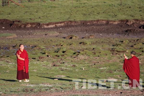這時(shí)正是早晨7點(diǎn)多鐘,各種野生動(dòng)物:高原鼠兔、鷹、黑頸鶴、斑頭雁、棕頭鷗等也剛剛醒來,四處活動(dòng),享受清晨高原太陽(yáng)的溫暖。那位年輕僧人對(duì)這片美景顯得非常留戀動(dòng)情,他站在草原上請(qǐng)隨行人員為他照相留念。其實(shí),這位年輕僧人就是出生于西藏那曲地區(qū)嘉黎縣的班禪額爾德尼o確吉杰布。因?yàn)樯L(zhǎng)在草原,所以十一世班禪大師每次見到草原美景,總是充滿了感情和發(fā)自內(nèi)心的熱愛,所以此次停在這片隆寶灘草原上賞景留影。