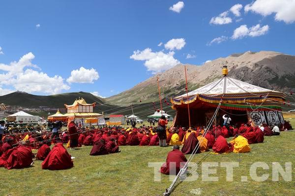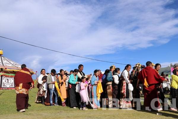 扎西灘草原此時(shí)草長(zhǎng)鶯飛、野花盛開,遠(yuǎn)處草原和藍(lán)天形成一條起伏的波浪線,潔白的云彩像牛奶一樣飄在空中。治多縣的僧人們和農(nóng)牧民群眾們已經(jīng)早早地、秩序井然地等候在草原上?!魃仔疟娫谠鳛┎菰邮荛L(zhǎng)壽經(jīng)祈愿灌頂。