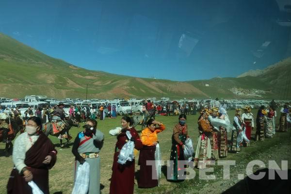 治多縣府是加吉博洛鎮(zhèn),當(dāng)班禪大師的車隊(duì)到達(dá)時(shí),幾乎全縣的人都趕來迎接遠(yuǎn)道而來的仁波切?!鲌D為翹首以盼等待班禪大師的信教群眾。