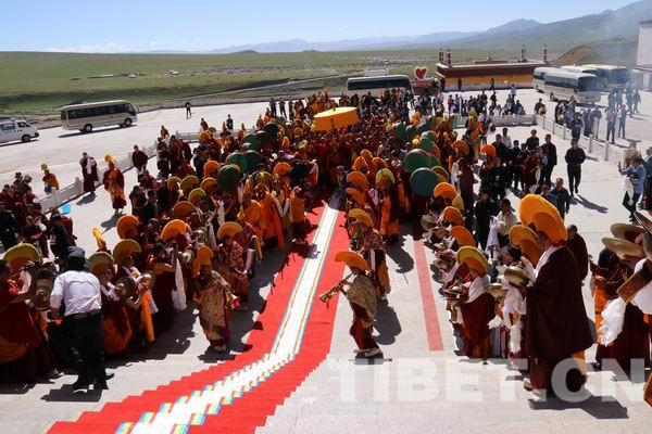 在各族群眾、僧尼、歌舞、馬隊(duì)、牦牛隊(duì)、車隊(duì)的熱烈歡迎中,班禪大師一行來到貢薩寺?!髫曀_寺僧人用傳統(tǒng)儀式歡迎班禪大師的到來。
