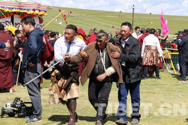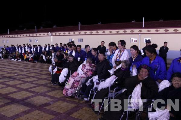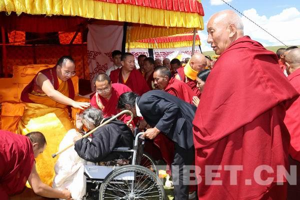 摸頂過程中還發(fā)生了很多感人的故事。有些年紀(jì)大、行動(dòng)不便的老人,周圍的人都主動(dòng)幫助他們提前接受班禪大師的摸頂;有些人因?yàn)樵陉?yáng)光下排隊(duì)等候時(shí)間太長(zhǎng),昏厥過去,馬上就得到了當(dāng)?shù)蒯t(yī)療志愿者的救治?!鲌D為等待班禪大師摸頂賜福的人群中,殘疾人和年紀(jì)大的信教群眾得到優(yōu)先照顧。