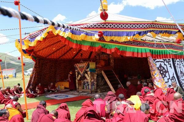 夏日草原的陽(yáng)光下,班禪大師在貢薩寺準(zhǔn)備的華帳寶座上進(jìn)行講經(jīng)和灌頂,同時(shí)大師還從佛法的角度對(duì)僧人和群眾進(jìn)行了遵紀(jì)守法、團(tuán)結(jié)互助、積極改善生活、改正惡習(xí)、維護(hù)民族團(tuán)結(jié)和社會(huì)和諧等方面的教誨?!靼喽U大師在寶帳中的法座上講法。