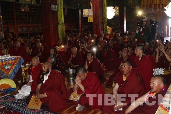 原計(jì)劃,治多縣信教群眾前來接受班禪大師的講經(jīng)灌頂和摸頂,應(yīng)于當(dāng)天下午6點(diǎn)結(jié)束。但實(shí)際上在進(jìn)行完長(zhǎng)壽經(jīng)祈愿灌頂后,已是下午3點(diǎn)半,為了能讓所有的信教群眾都受到祝福,班禪大師為近2萬(wàn)信教群眾一一摸頂,直至晚上9點(diǎn)多。經(jīng)過整整9個(gè)多小時(shí),在班禪仁波切心懷眾生、慈悲利眾精神的堅(jiān)持下,大部分的信教群眾都得到了滿足?!鲌D為認(rèn)真聽法的貢薩寺僧眾。