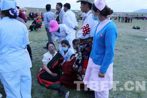 還有一位當(dāng)?shù)卦袐D,在排隊(duì)等候摸頂過程中,當(dāng)場(chǎng)生下了孩子,母子除了得到當(dāng)?shù)卣疁?zhǔn)備的醫(yī)療救助安然無(wú)恙之外,孩子還得到班禪大師賜名——“班禪吉”?!鲌D為法會(huì)現(xiàn)場(chǎng)由當(dāng)?shù)卣才诺尼t(yī)療工作者們起到了很大的作用。