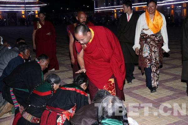 班禪大師在灌頂法會(huì)和摸頂儀式中,不斷說的一句話就是:“我已經(jīng)祈愿祝福了你們!我已經(jīng)祈愿祝福了你!愿幸福和安康生生世世伴隨?!?9個(gè)小時(shí)里,記者累了,可以歇一會(huì);安保人員累了,可以換崗;老百姓累了,可以坐草地上;誦經(jīng)僧人累了,可以換人。所有的人都可以休息,只有班禪大師一人不能休息,為了讓所有信教群眾心滿意足,他心懷慈悲擔(dān)起了一位宗教領(lǐng)袖的責(zé)任?!鲌D為班禪大師在幸福敬老院誦經(jīng)祈福。