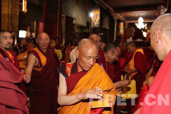 近千名僧人獲得了班禪大師的摸頂賜福,僧人們按照自己心意向班禪大師獻(xiàn)上供養(yǎng)和禮品,班禪大師也一一向僧人們發(fā)放布施和護(hù)身符、紀(jì)念品?!鲌D為班禪大師接受貢薩寺的僧人們寫給他的頌詞。