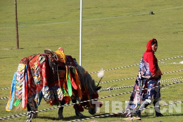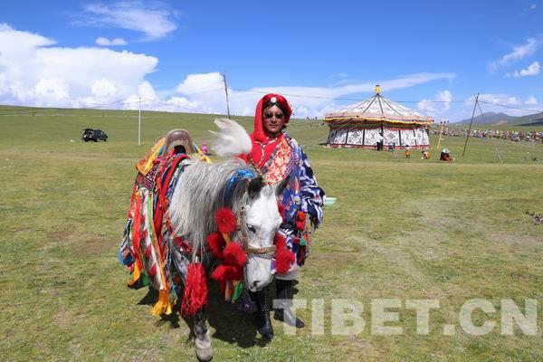 △圖為治多縣當(dāng)?shù)匦沤倘罕姕?zhǔn)備獻(xiàn)給班禪大師的駿馬,這匹駿馬曾在賽馬會(huì)上取得第一名。