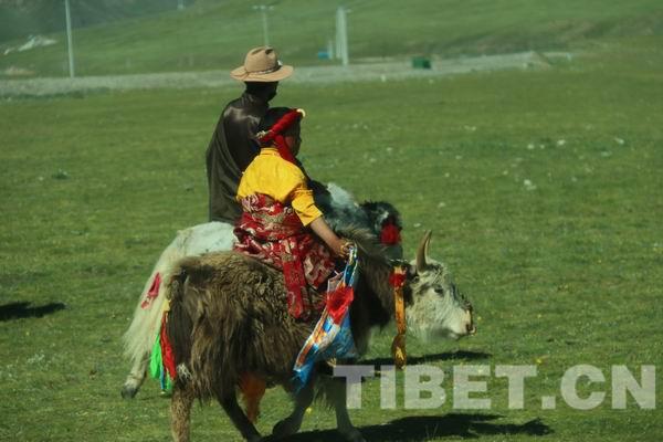 △圖為騎著牦牛迎接班禪大師的治多縣當(dāng)?shù)厣倌辍?/p>