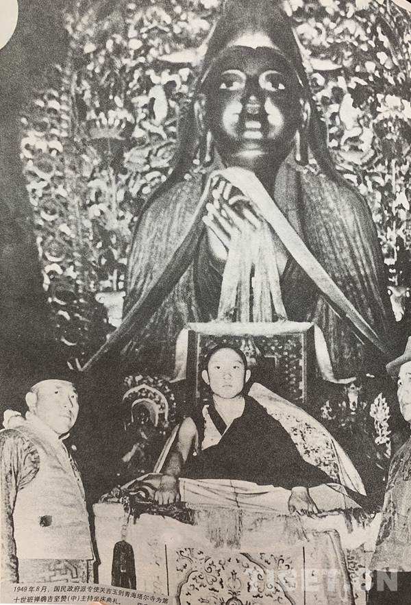 1949年8月,國民政府派專使關(guān)吉玉到青海塔爾寺為十世班禪額爾德尼o確吉堅贊(中)主持坐床典禮。(圖片翻拍自《金鑰匙o(hù)十七條協(xié)議》 陳宗烈提供)