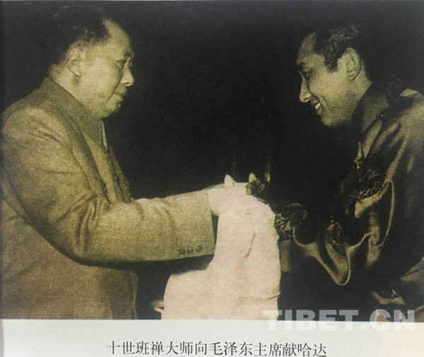 圖為十世班禪向毛澤東主席敬獻哈達。圖片翻拍自《班禪額爾德尼評傳》