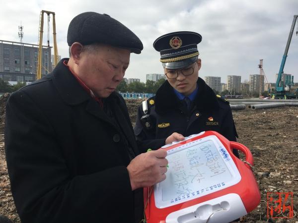 張海清用畫畫板向丁橋二號(hào)港執(zhí)法長吳東超溝通問題。
