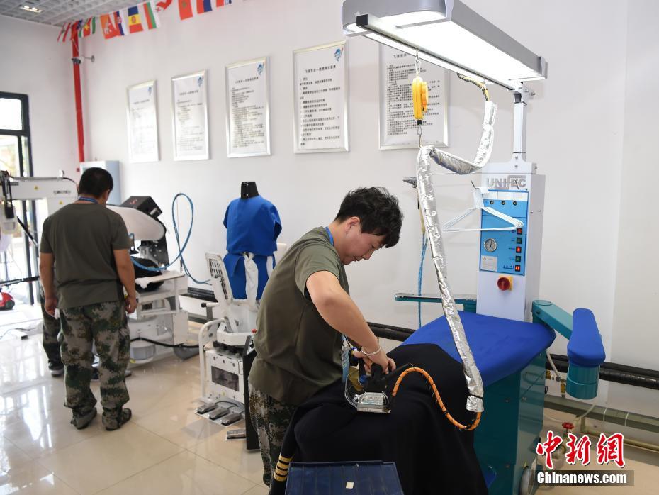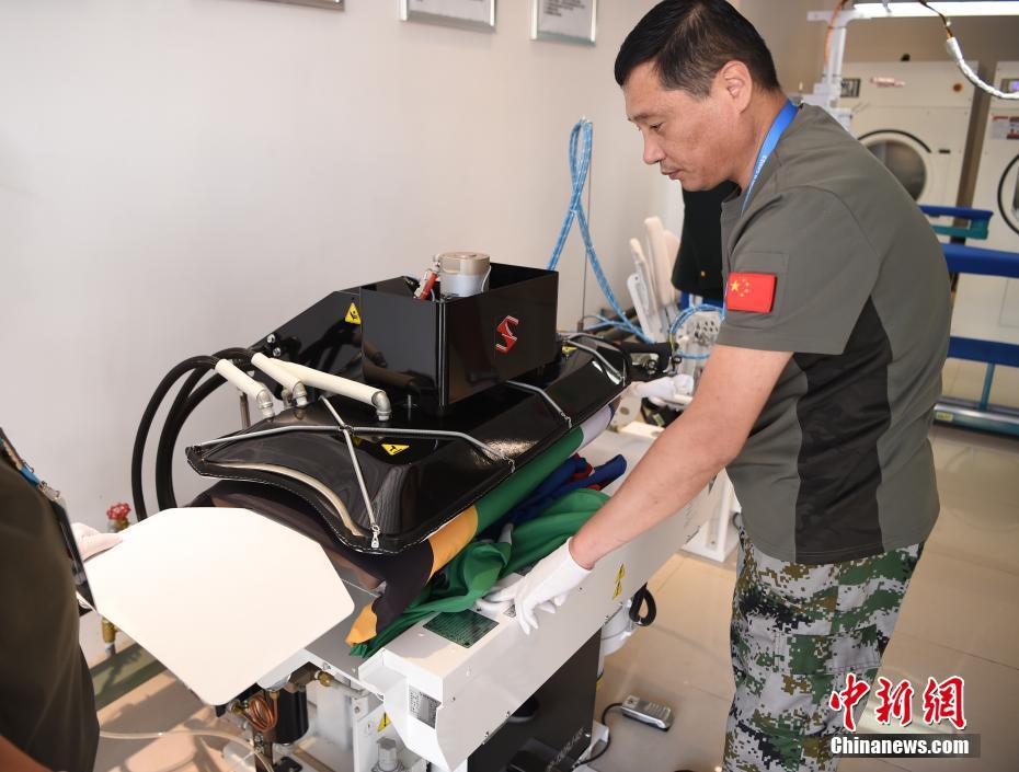 龔寶翠在熨燙軍裝。洗滌服務保障組工作間面積不大,但干洗機、熨燙機、洗鞋機等各式設備一應俱全。中新社記者 侯宇 攝