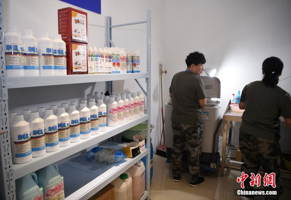 軍嫂龔寶翠和同事在工作間作業(yè)。洗滌服務保障組使用的洗滌劑等均達到了相應的標準。中新社記者 侯宇 攝
