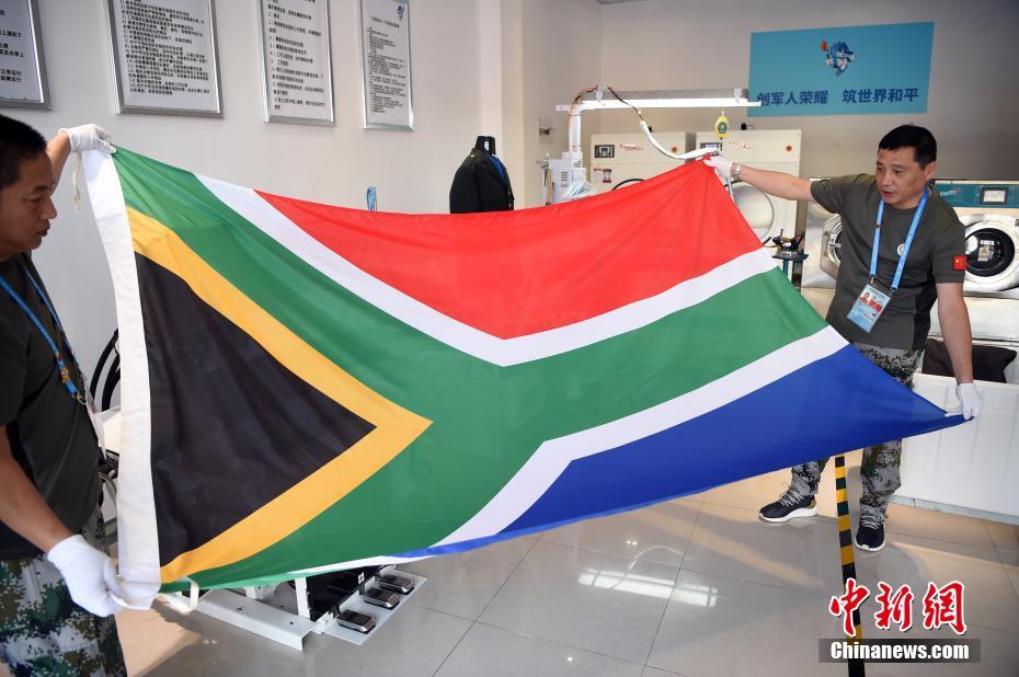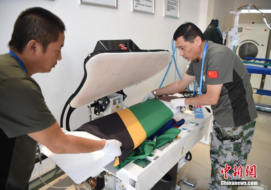 退伍軍人王繼東(左)和同事王雪峰準備熨燙一面南非國旗。中新社記者 侯宇 攝
