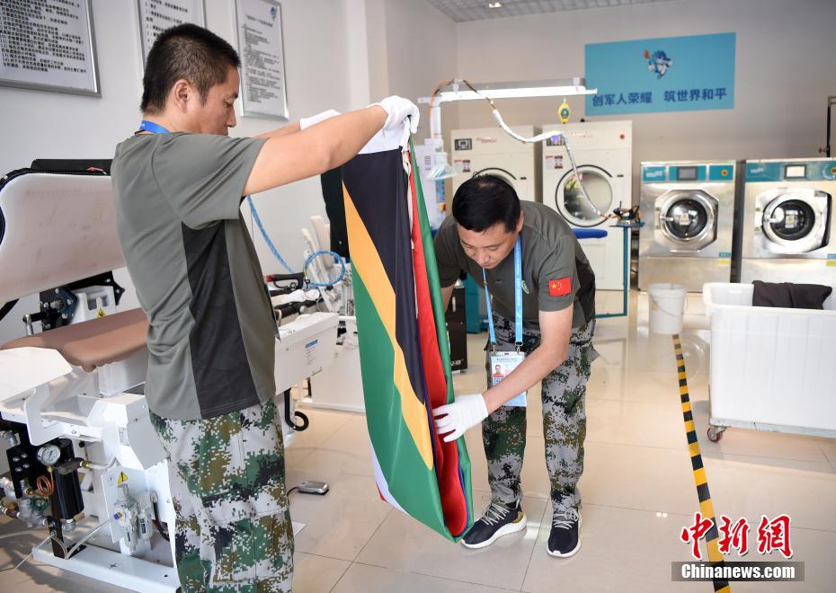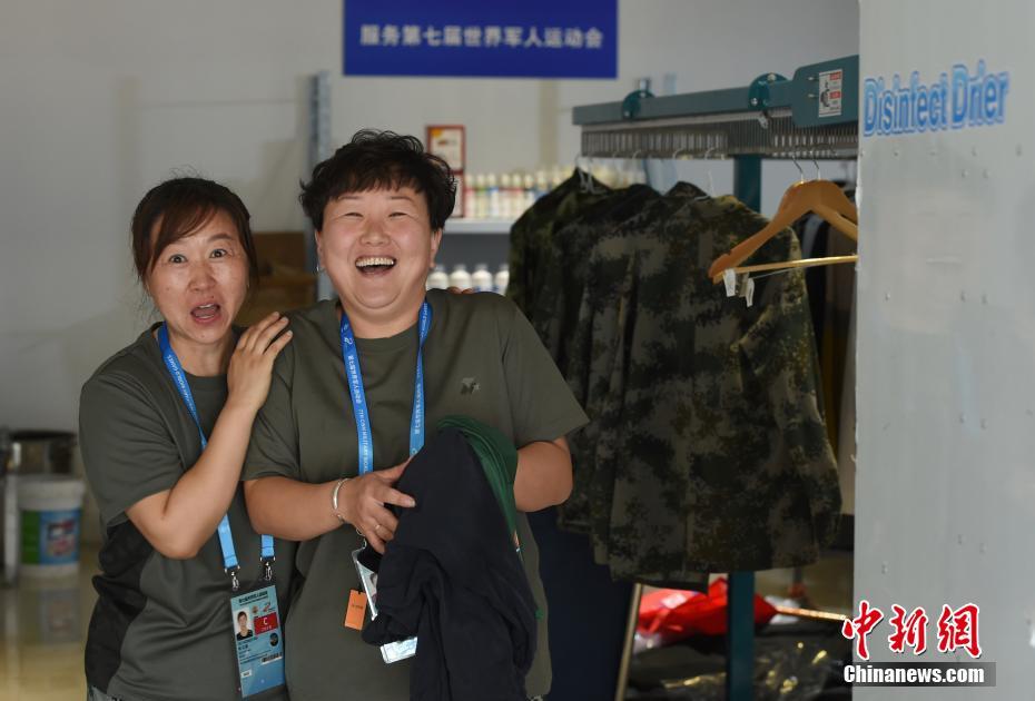 位于湖北省武漢市的第七屆世界軍人運動會運動員村(軍運村)里,有一群提供洗滌熨燙服務的軍哥軍嫂:他們都是退伍軍人或軍屬。洗滌服務保障組副組長王繼東介紹,保障組由25人組成,每個班次有9人,每天8點半至22點半,為入住軍運村的運動員、代表團官員提供衣物清潔、修補等保障工作。除此之外,他們還負責熨燙軍運會會旗、國際軍事體育理事會會旗、各成員國國旗等300余面旗幟。由他們親手熨燙好的旗幟會被送至軍運會禮賓部,供各項目比賽結束后的頒獎及升旗儀式等使用。圖為參加武漢軍運會的巴西代表團官員來到洗滌服務保障組送洗衣物,接待他們的軍嫂熱情認真地提供服務。中新社記者 侯宇 攝