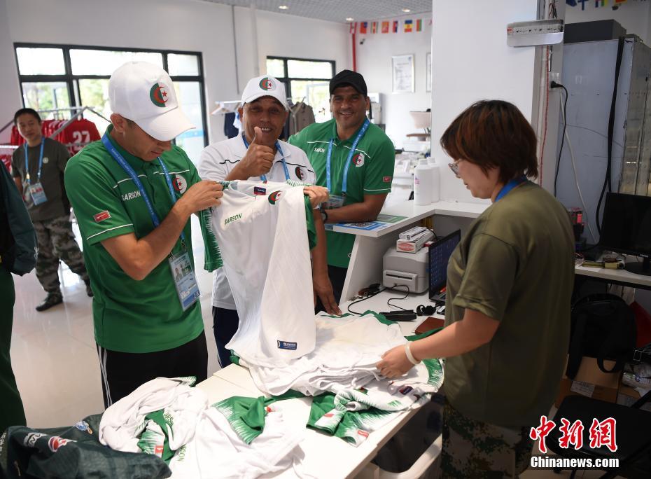 阿爾及利亞代表團的運動員和官員前來領取洗好的隊服,對洗滌保障組精細的服務豎起大拇指。中新社記者 侯宇 攝