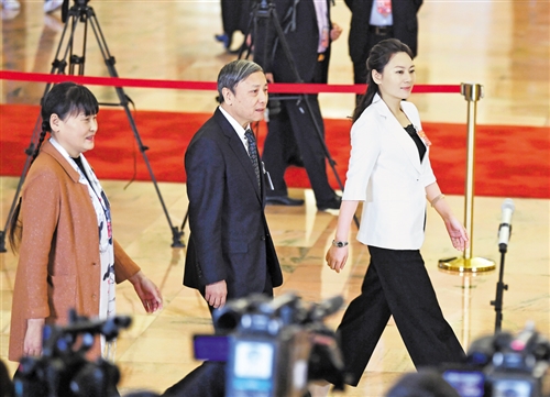 支月英代表、蔡昉代表、王欣會(huì)代表(從左至右)步入“代表通道”準(zhǔn)備接受采訪。記者 李景錄攝