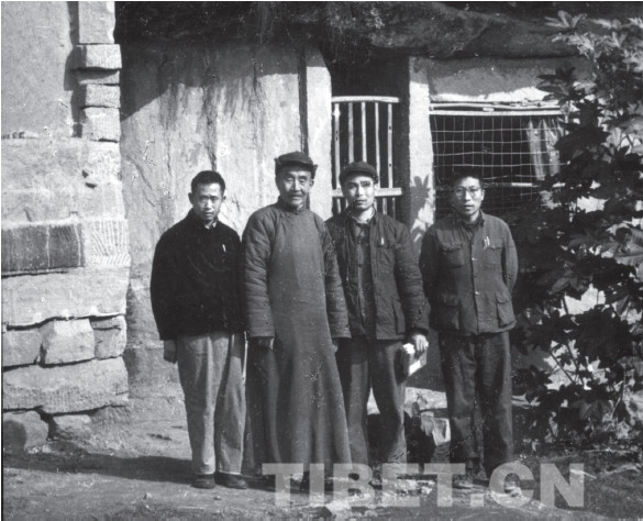 1974 年,任乃強(qiáng)先生(左二)與考古人員在巖屋前