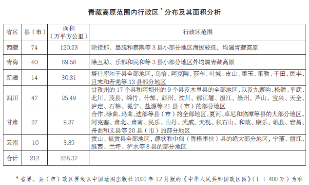 在行政區(qū)劃上,青藏高原范圍涉及6個(gè)省區(qū)、212個(gè)縣(市),即西藏自治區(qū)(錯(cuò)那、墨脫和察隅等3縣僅包括少部分地區(qū))和青海?。ú糠挚h僅含局部地區(qū)),云南省西北部迪慶藏族自治州,四川省西部甘孜藏族自治州和阿壩藏族羌族自治州、木里藏族自治縣,甘肅省的甘南藏族自治州、天祝藏族自治縣、肅南裕固族自治縣、肅北蒙古族自治縣、阿克塞哈薩克族自治縣以及新疆維吾爾自治區(qū)南緣巴音郭楞蒙古自治州、和田地區(qū)、喀什地區(qū)以及克孜勒蘇柯?tīng)柨俗巫灾沃莸鹊牟糠值貐^(qū)。