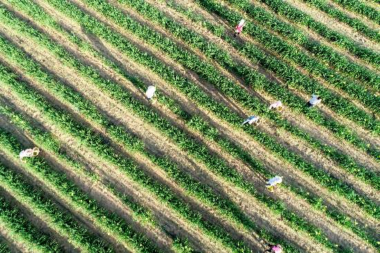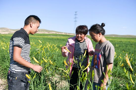 吳忠市太陽(yáng)山清泉林業(yè)專業(yè)合作社負(fù)責(zé)人李志巧正在教兩名勤工儉學(xué)的孩子如何采摘黃花菜。