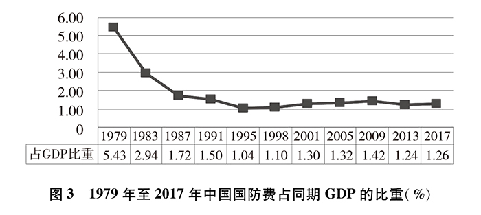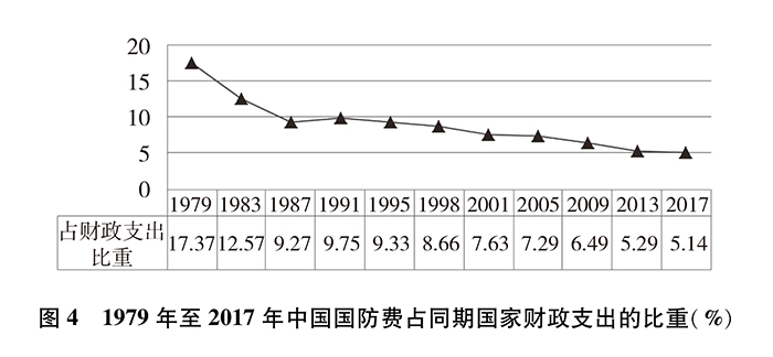 改革開放以來,中國(guó)國(guó)防開支經(jīng)歷了從維持性投入到適度增長(zhǎng)的發(fā)展歷程,總體保持與國(guó)家經(jīng)濟(jì)和財(cái)政支出同步適度協(xié)調(diào)增長(zhǎng)。國(guó)防費(fèi)占國(guó)內(nèi)生產(chǎn)總值(GDP)比重從1979年最高的5.43%下降到2017年的1.26%,近30年一直保持在2%以內(nèi)。1979年國(guó)防費(fèi)占國(guó)家財(cái)政支出比重為17.37%,2017年為5.14%,下降超過12個(gè)百分點(diǎn),總體下降趨勢(shì)明顯。