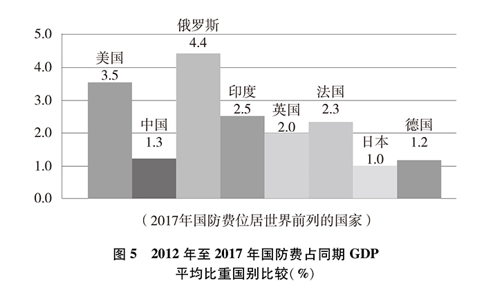 從國(guó)防費(fèi)占國(guó)內(nèi)生產(chǎn)總值比重看,2012年至2017年,中國(guó)國(guó)防費(fèi)占國(guó)內(nèi)生產(chǎn)總值平均比重約為1.3%,美國(guó)約為3.5%、俄羅斯約為4.4%、印度約為2.5%、英國(guó)約為2.0%、法國(guó)約為2.3%、日本約為1.0%、德國(guó)約為1.2%。中國(guó)國(guó)防費(fèi)占國(guó)內(nèi)生產(chǎn)總值的平均比重在國(guó)防費(fèi)位居世界前列的國(guó)家中排在第六位,是聯(lián)合國(guó)安理會(huì)常任理事國(guó)中最低的。