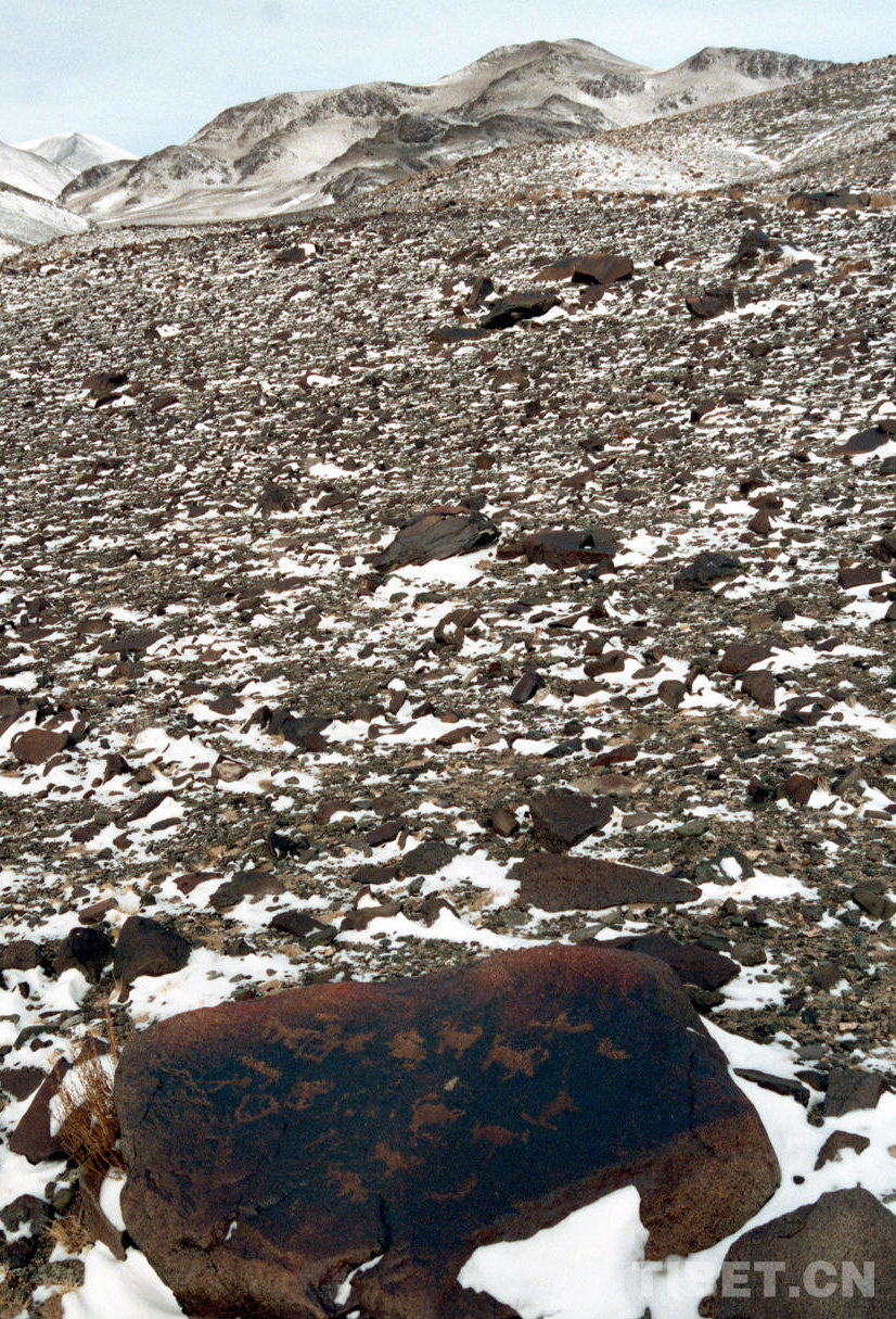 無獨有偶。在后來的幾天里,我們在那曲地區(qū)(現那曲市)尼瑪縣榮瑪鄉(xiāng)加林山俄東溝也發(fā)現了大量石頭巖畫。