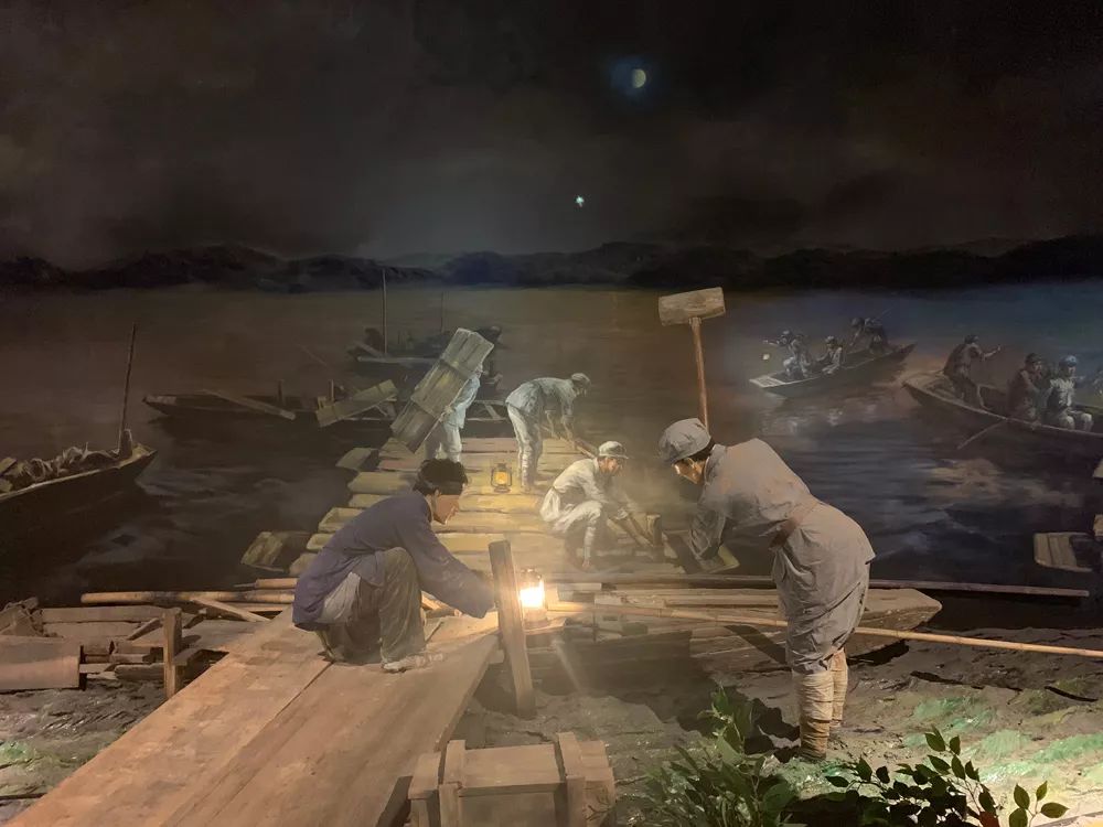 中央紅軍長征出發(fā)紀念館中再現(xiàn)了軍民為避免敵機偵察被發(fā)現(xiàn),在夜間搭建浮橋的場景