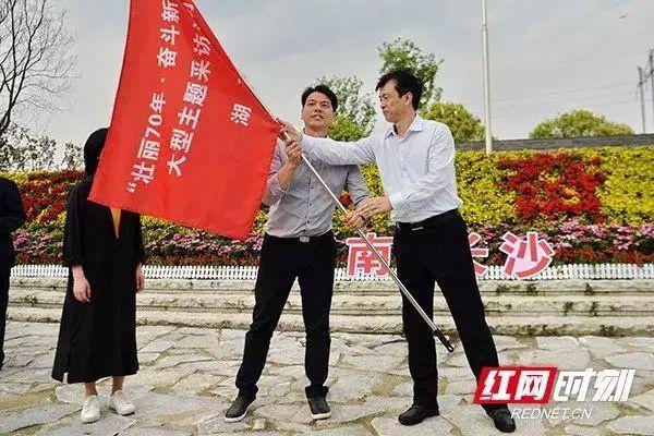 中共湖南省委常委、宣傳部長蔡振紅為湖南日報(bào)、紅網(wǎng)蹲點(diǎn)記者代表授旗。