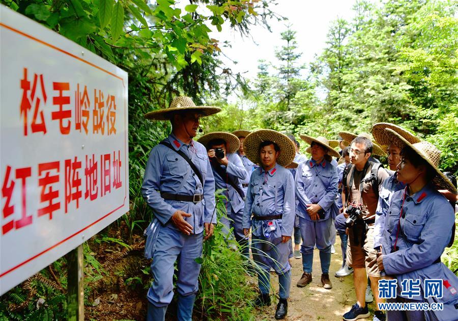 6月17日,記者們在松毛嶺戰(zhàn)役紅軍陣地舊址進(jìn)行體驗式采訪。 新華社記者魏培全攝