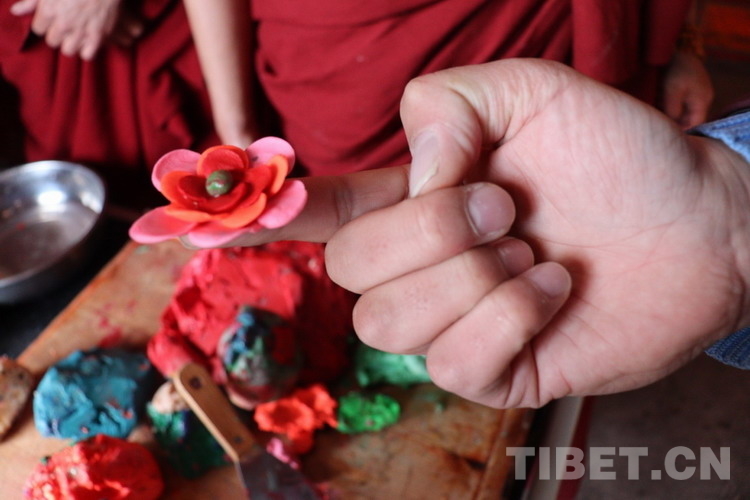 圖為僧人現(xiàn)場(chǎng)制作的酥油花 攝影:澤仁措姆