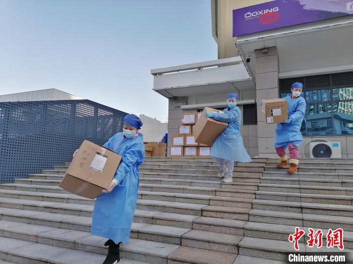 近日,武昌方艙醫(yī)院“管家”、武漢大學人民醫(yī)院對外聯(lián)絡(luò)部牽頭負責人沈嵐接受記者采訪。圖為沈嵐(左一)在方艙醫(yī)院搬運物資。武大人民醫(yī)院供圖