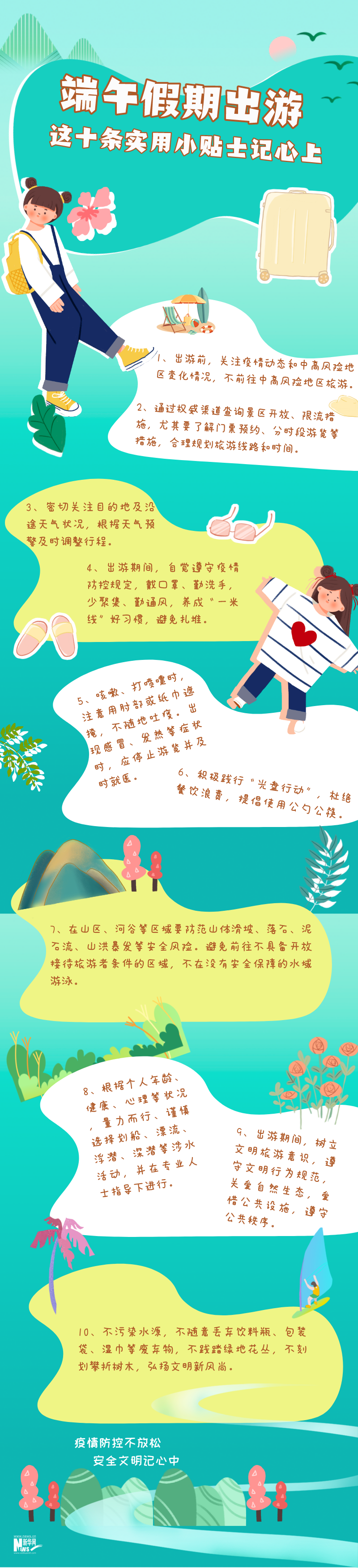 端午節(jié)假期將至,人員流動增多,在落實常態(tài)化疫情防控的前提下,對于有出游安排的旅客,如何在出游期間做到疫情防控不放松,安全文明記心中?這十條實用小貼士請收下。