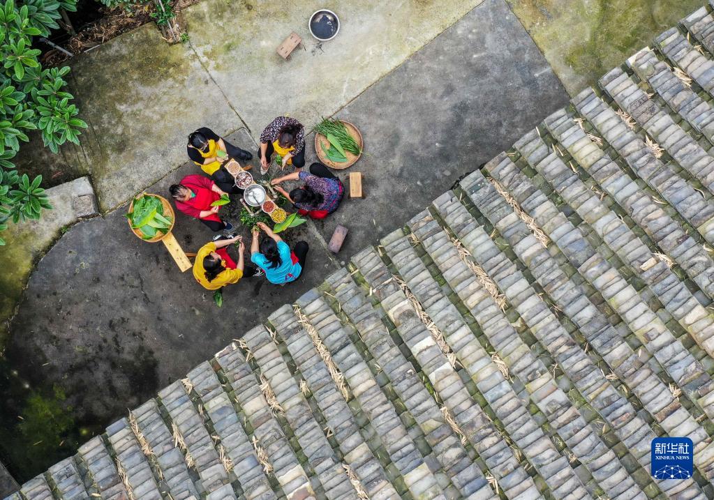 5月25日,村民在貴州省岑鞏縣思旸鎮(zhèn)龍江村包粽子(無人機(jī)照片)。新華社發(fā)(胡攀學(xué) 攝)