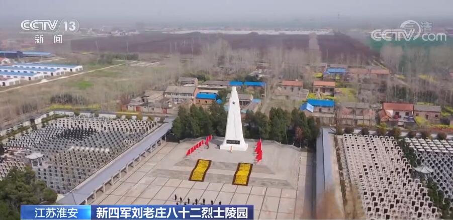 現(xiàn)在我們看到的是位于江蘇淮安的劉老莊八十二烈士陵園。1943年春,侵華日軍對蘇北抗日根據(jù)地進行掃蕩。新四軍三師七旅十九團二營四連的82名官兵為了掩護群眾和當?shù)貦C關安全轉(zhuǎn)移,在劉老莊和一千余日寇進行殊死血戰(zhàn),斃敵170多人,終因寡不敵眾全部壯烈犧牲??箲?zhàn)勝利后,這支英雄的連隊被命名為“劉老莊連”。